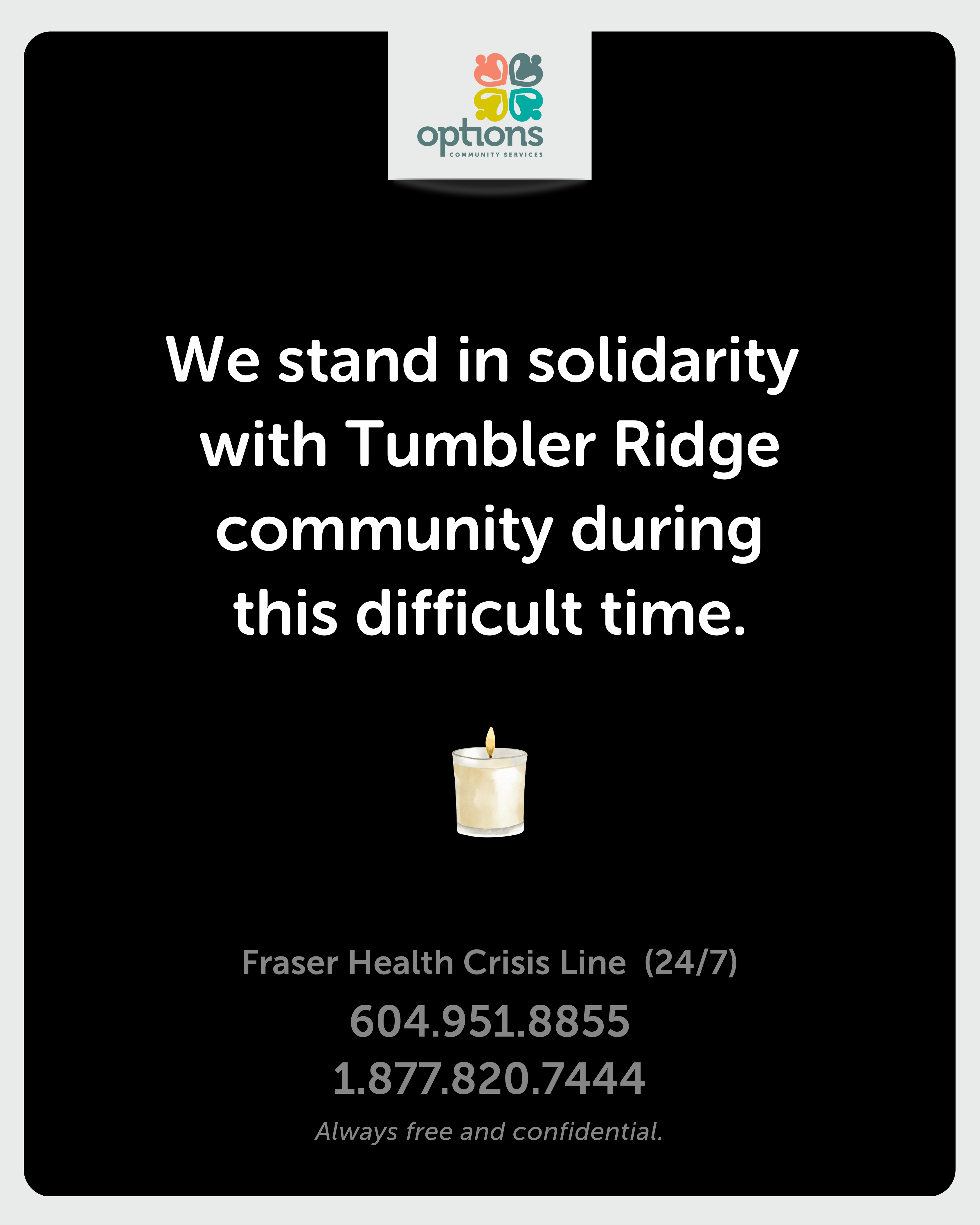Options Community Services (OCS) extends our sincere condolences to everyone affected by the recent heartbreaking incident in the Tumbler Ridge community, including the families and broader community surrounding them.