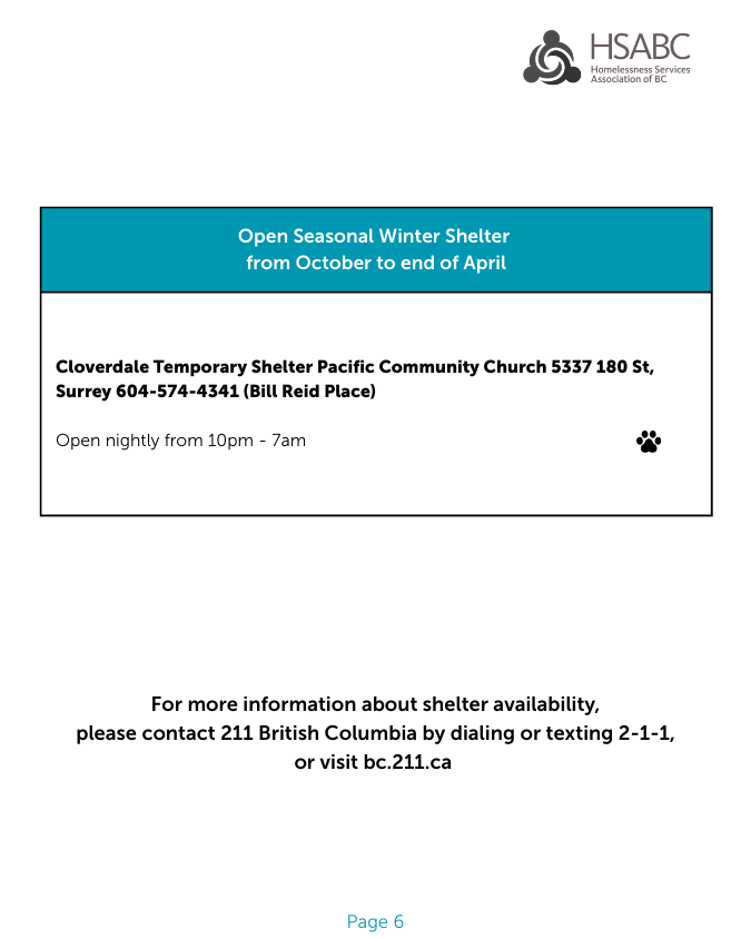 For more information about shelter availability, please contact 211 British Columbia. Call or text 2-1-1, or visit bc.211.ca